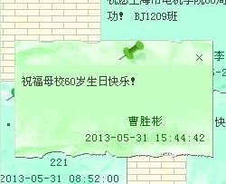 当母校60华诞庆典日2013年10月6日迈着轻盈的脚步向我们款款走来的时候,校庆办特别面向在校师生推出“迎校庆写祝福送礼品”活动。 活动期间,登陆上海电机学院60周年校庆专题网,进入“祝福母校”栏目,写下您对母校的祝福,即可凭祝福内容和有效证件领取精美礼品一份。 活动期间:6月3日到6月7日; 礼品领取时间:6月8日中午12—13时; 领取地点: 临港校区:学生事务中心; 闵行校区:华宁路校区就业指导中心; 领取凭证:祝福内容、本人署名的网页截屏打印稿或手机拍照。如下图:  本次活动教工礼品为“金兰珍宴礼盒”,学生礼品为“粽子”,数量有限,请勿代领,先到先得,送完为止。 校庆办 2013年6月3 |