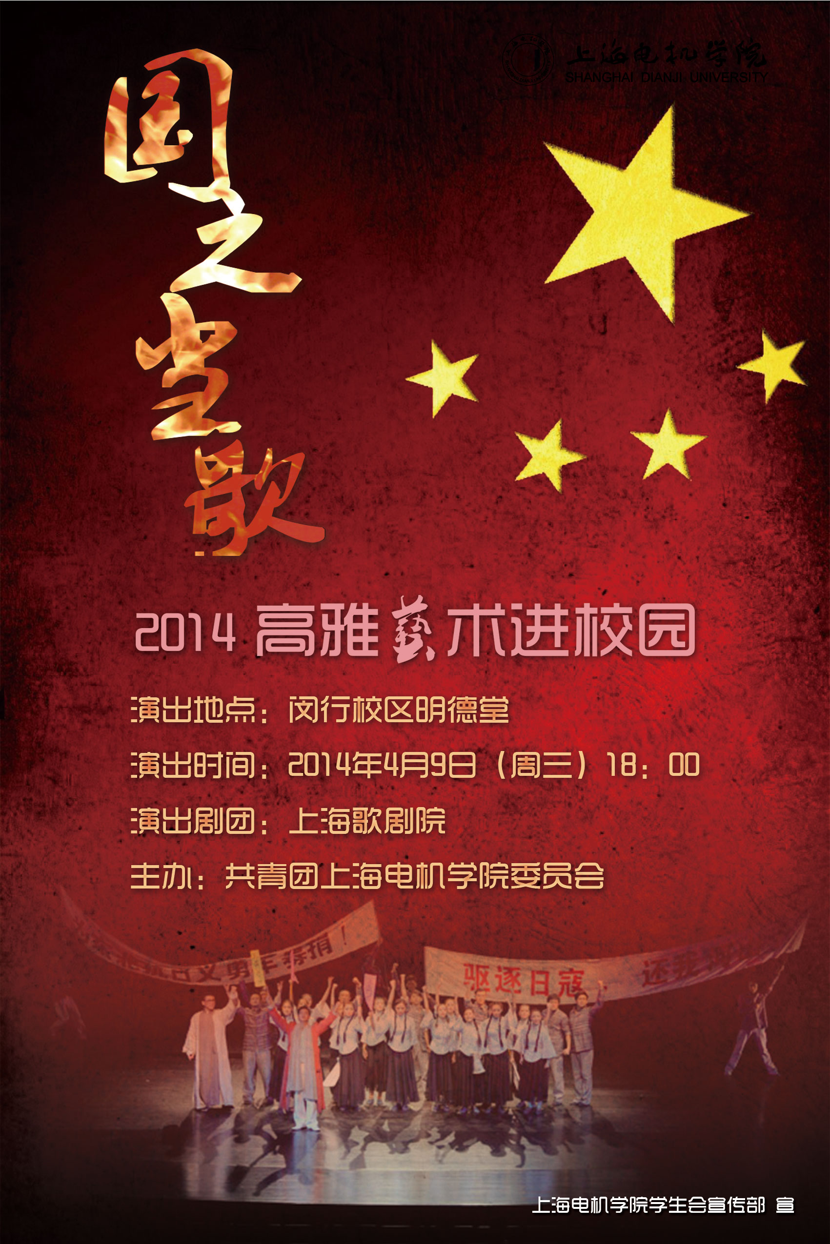 | 2 | 4月9日(周三) 18:00 | 闵行校区 明德堂 | 2014年高雅艺术进校园(二) 演出剧目:音乐剧《国之当歌》 演出单位:上海歌剧院 主办:校团委、学生会 承办:高职学院团总支、学生分会 |
