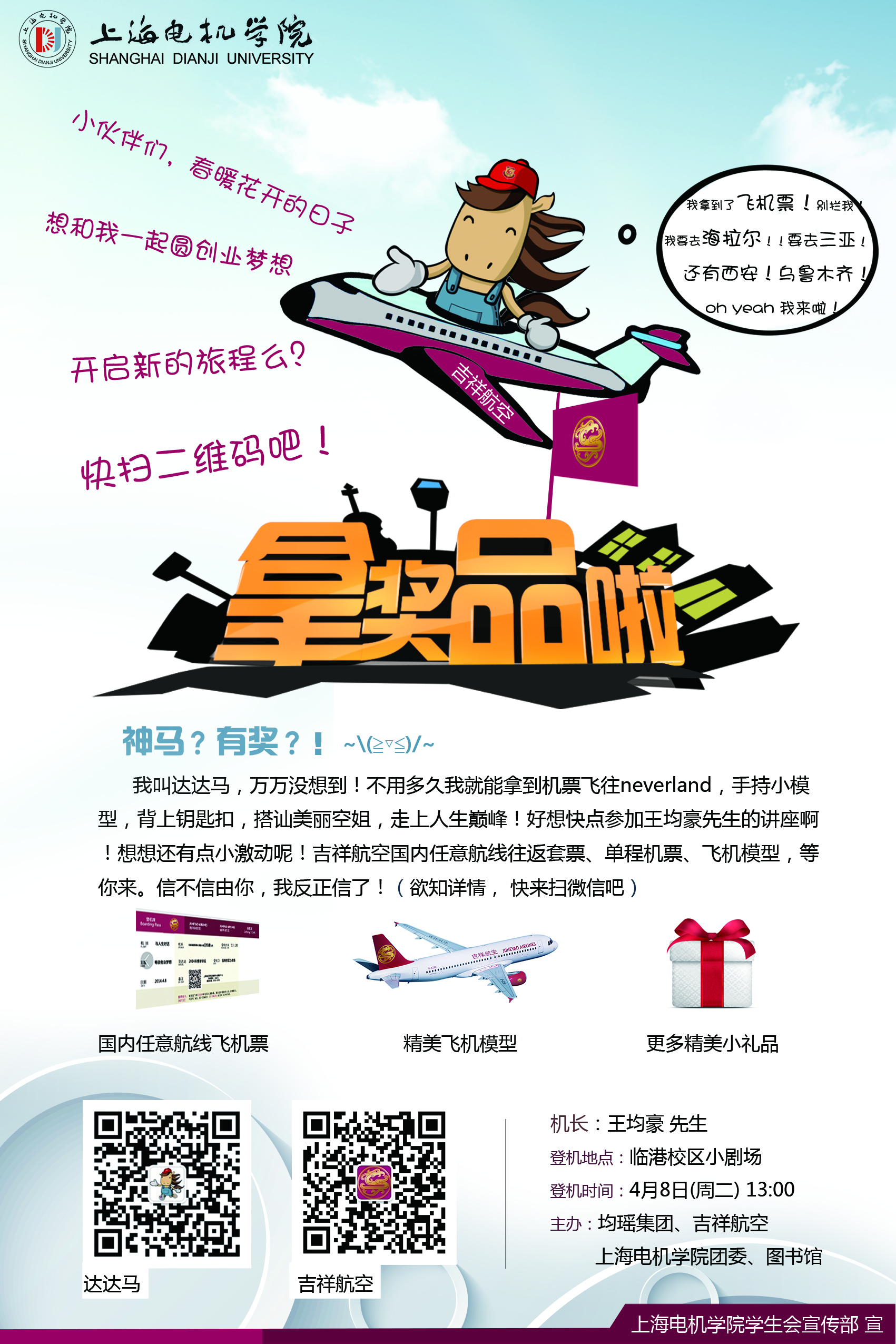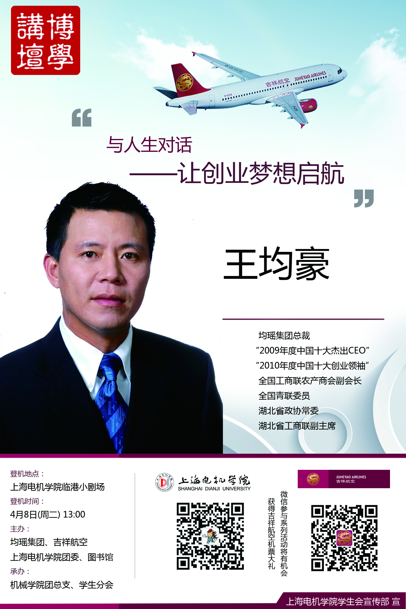 | 2 | 4月1日(周二) 11:30 | 临港校区 第一食堂 | 博学讲坛宣传活动 2014年博学讲坛第三讲 时间:4月8日13:00 地点:临港小剧场 主题: 与人生对话—让创业梦想启航 主讲嘉宾:王均豪 嘉宾简介:2009年度中国十大杰出CEO、 2010年度中国十大创业领袖、全国工商联农产商会副会长、全国青联委员、湖北省政协常委、湖北省工商联副主席 主办:均瑶集团、吉祥航空 校团委、图书馆 承办:机械学院团总支、学生分会 |