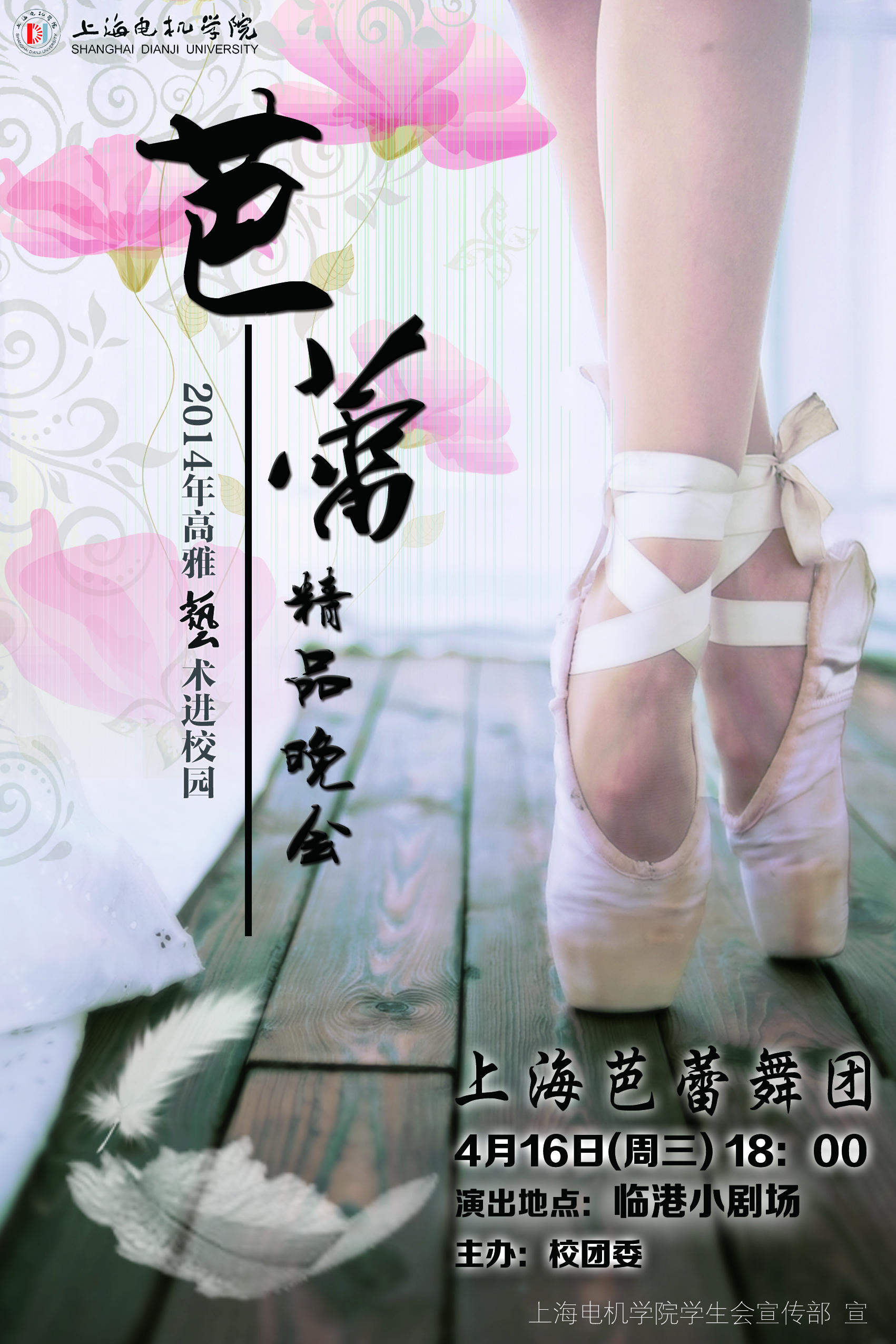 | 5 | 4月16日(周三) 18:00 | 临港小剧场 | 2014年高雅艺术进校园(三) 演出剧目:《芭蕾精品晚会》 演出单位:上海芭蕾舞团 主办:校团委 承办:机械学院 |