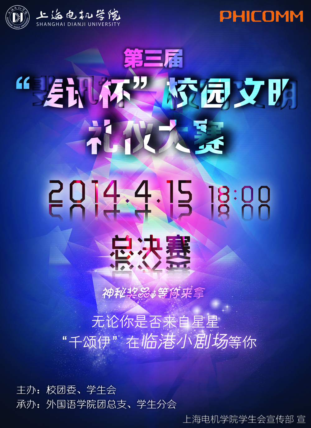 | 4 | 4月15日(周二) 18:00 | 临港小剧场 | 第三届“斐讯杯”校园文明礼仪大赛决赛 主办:校团委、学生会 承办:外国语学院团总支、学生分会 |