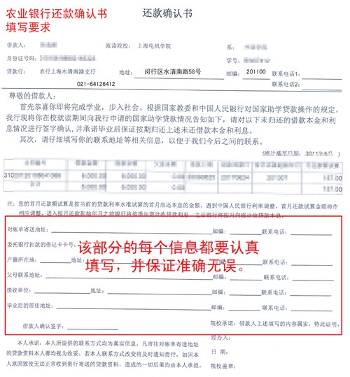附:还款确认书填写样板要求 和 中国农业银行个人贷款还款凭证(可参阅学生处网站“资助工作”一栏)