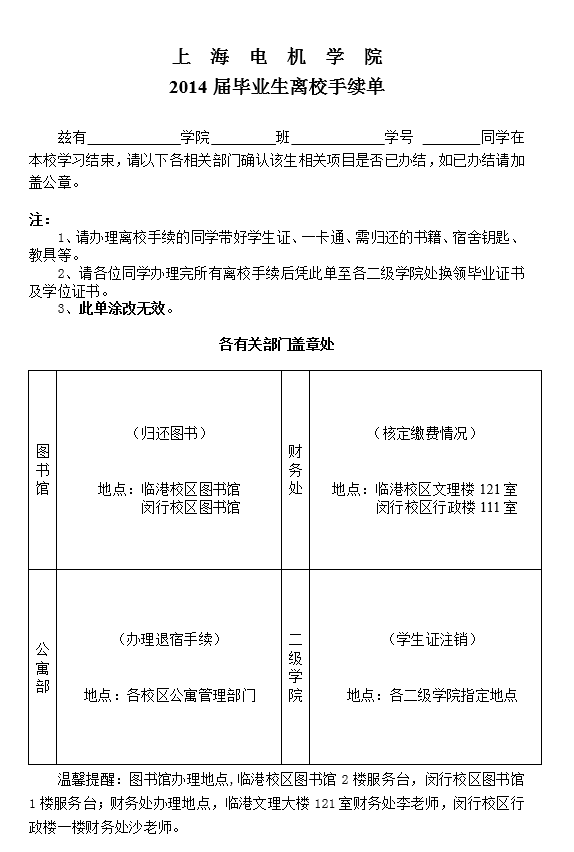 2014届毕业生离校手续单