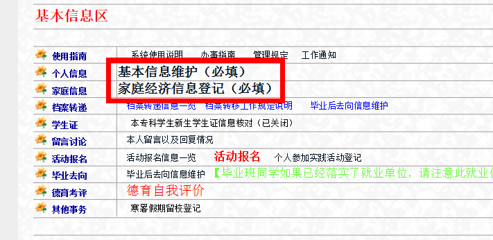 现要求学生必须登陆该系统,在10月8日前将 “基本信息区”中的“基本信息维护”和“家庭经济信息登记”两部分填写完整。