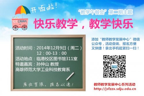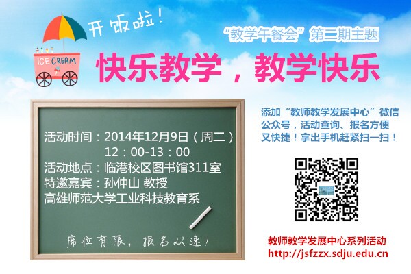 随着首期教学午餐会的成功举办,第二期“教学午餐会”我们将特邀台湾高雄师范大学孙仲山教授,与大家一起分享与探讨“乐在其中的教学经验”、“难以忘怀的教学经验”。我们衷心期待广大教师能积极参与!
