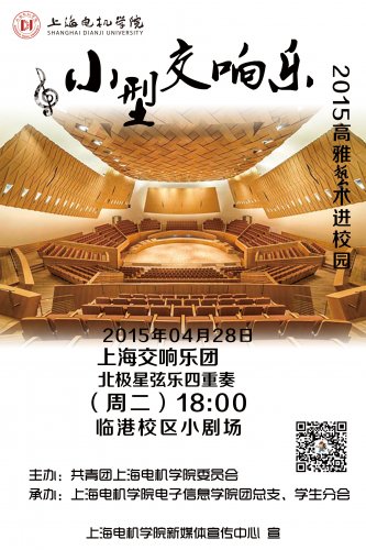 | 5 | 4月28日(周二) 18:00 | 临港校区 小剧场 | 2015年高雅艺术进校园 演出剧目:“北极星弦乐四重奏”专场音乐会 演出单位:上海交响乐团 主办:校团委 承办:电子信息学院团总支、学生分会 |
