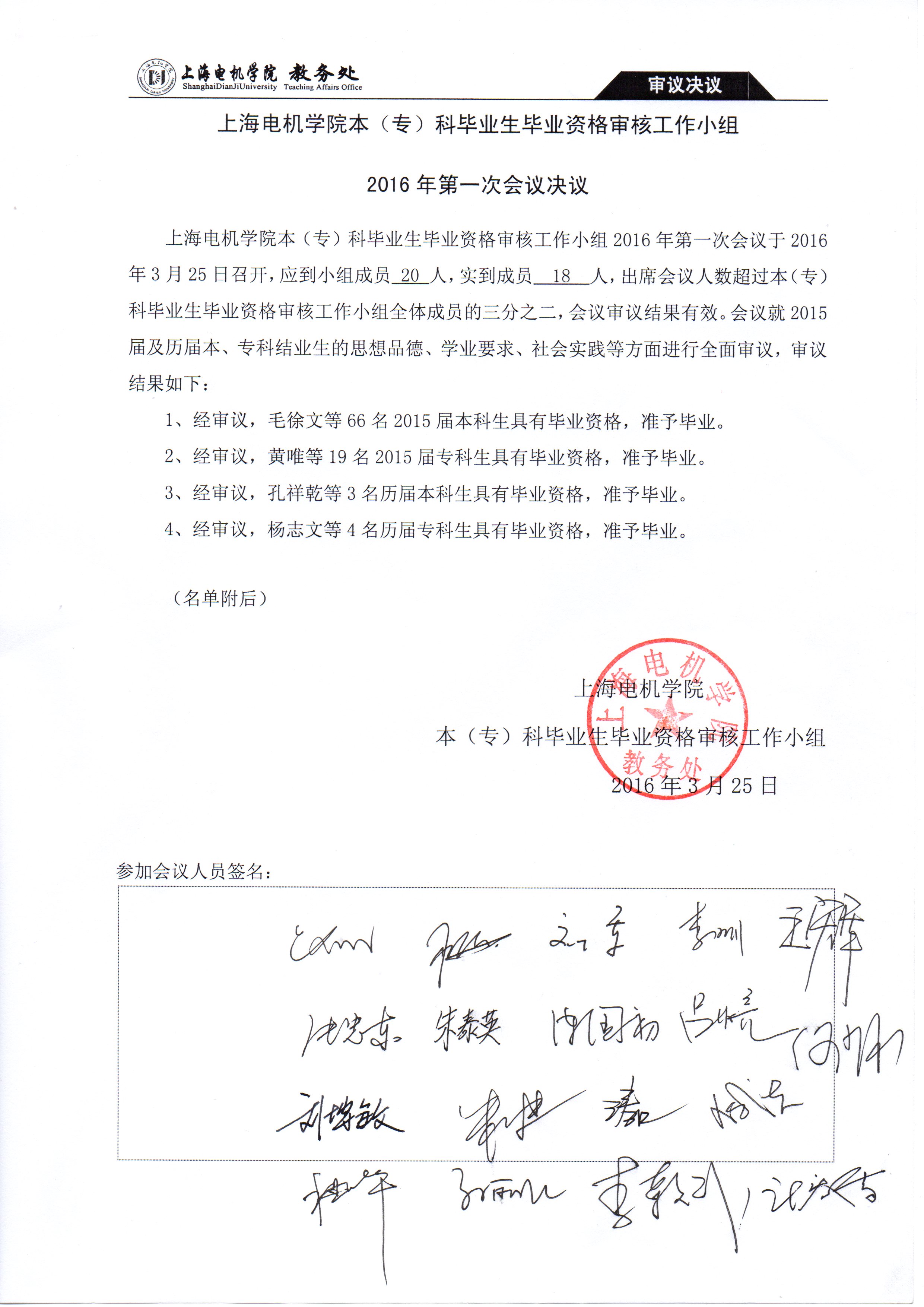 上海电机学院毕业资格审核工作小组于2016年3月25日召开了2016年第一次工作会议,会议对2015届结业学生及历届结业生的毕业资格进行了审议,现予以公示。