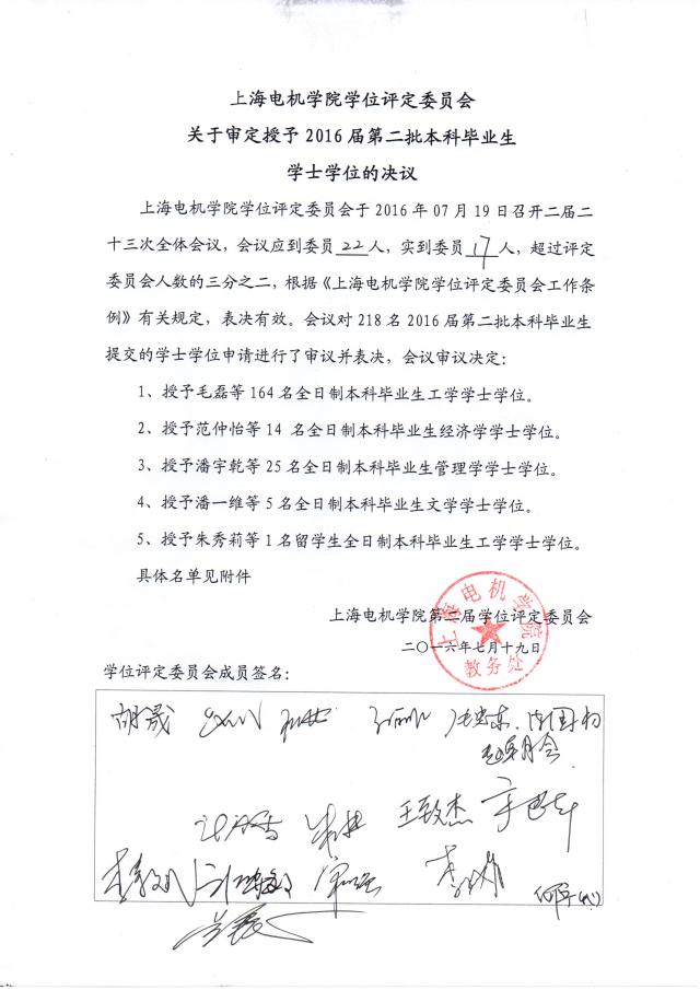 上海电机学院学位评定委员会二届二十三次全体会议于2016年7月19日召开,对2016届本科毕业生(含留学生)及历届本科毕业生的学位授予进行了审议并形成决议,具体详见附