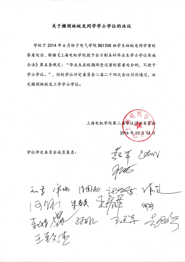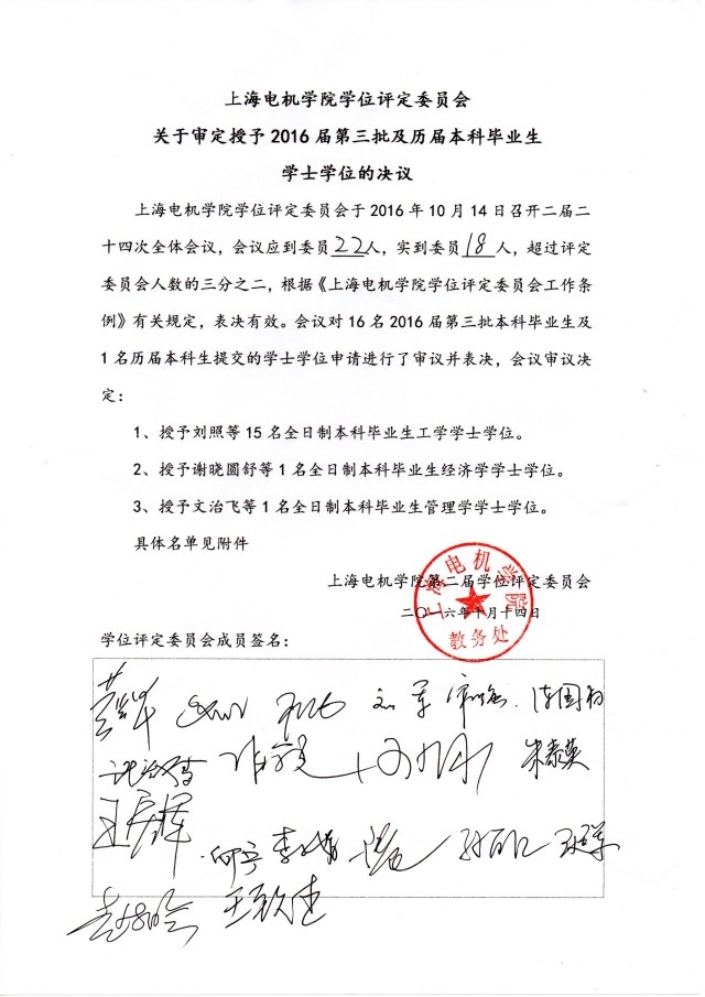 上海电机学院学位评定委员会二届二十四次全体会议于2016年10月14日召开,对2016届本科毕业生及历届本科毕业生的学位授予进行了审议并形成决议,具体详见附