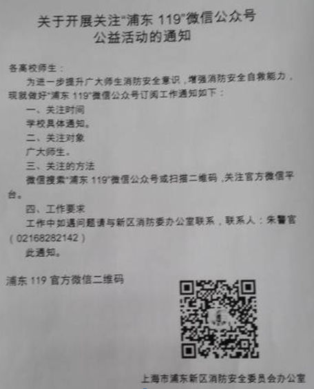 请全体师生员工用微信搜索“浦东119”微信公众号或扫描上方浦东119官方微信二维码。请各部门、二级学院(部)务必通知本部门师生员工积极参与11月9日当日活动,并于11月10日把将关注119微信公众号活动汇总表上报保卫处。