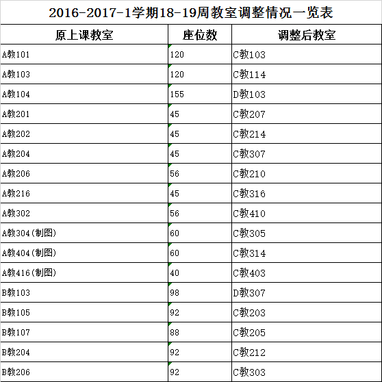 因学校标准化考场建设,原定18-19周在A教和B教(除A116外)上课的教室,变更到C教和D教上课。