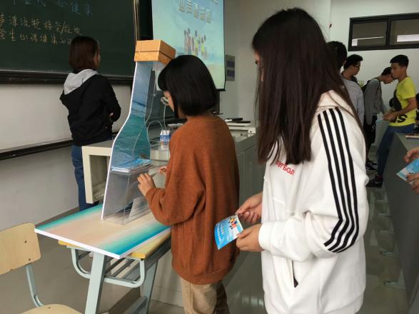 下午两点,在C412教室开展了接受/投放“心声漂流瓶”现场活动。根据青年人群常见心理健康问题,整理挑选部分有代表性的话题制作了写有心声留言的信息卡片,放置在统一的漂流瓶道具中,邀请讲座现场参与活动的学生进行卡片的抽取,并在卡片上书写反馈留言后放回漂流瓶中,完成接受和投放活动。通过对心声留言的解读,促使大学生关注、反思常见心理问题,并引导他们主动进行自我疏导。