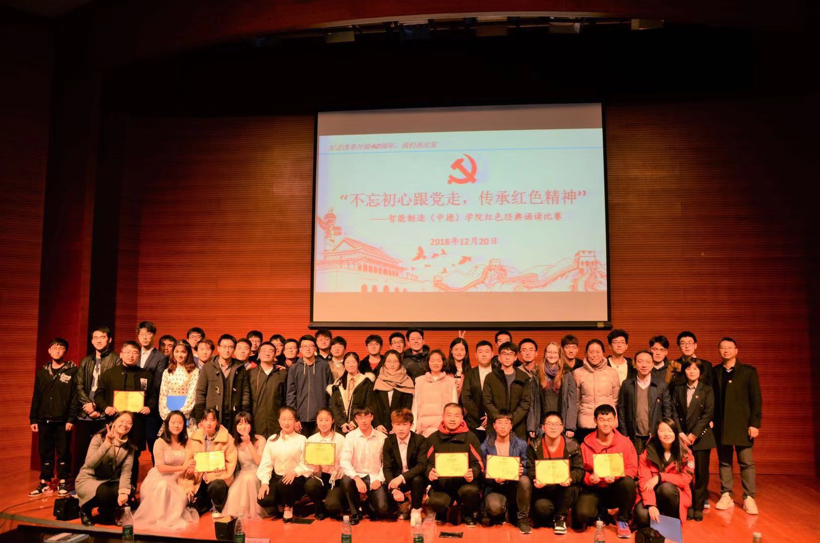 为纪念改革开放四十周年,铭记党恩,牢记使命再出发,12月20日,智能制造(中德)学院直属党支部在图书馆报告厅成功举办“不忘初心跟党走,传承红色精神”红色经典诵读大赛。直属党支部书记卞一明、支部成员苏庆刚、李玲等党员、入党积极分子和学生代表参加了此次活动,学院教师代表刘将将、陆沛烨、外教及学生干部代表参加并担任评委。