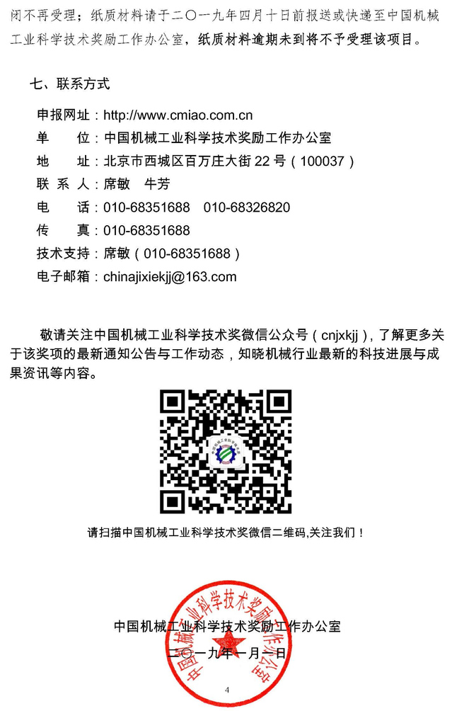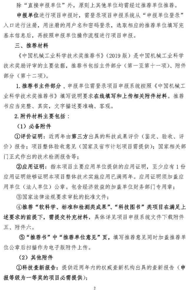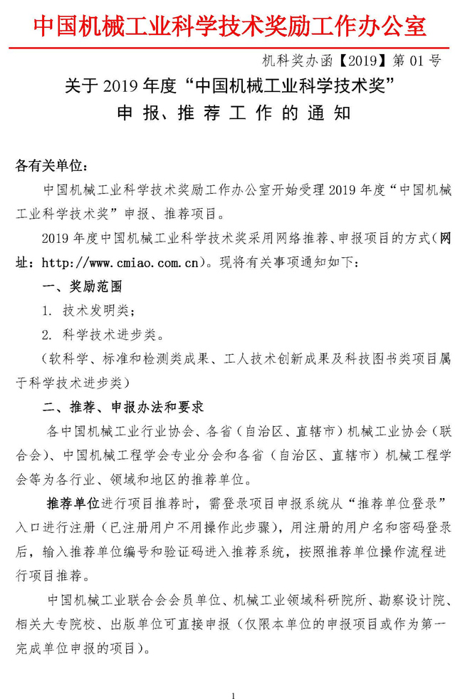2019年度“中国机械工业科学技术奖”申报、推荐工作已经启动。