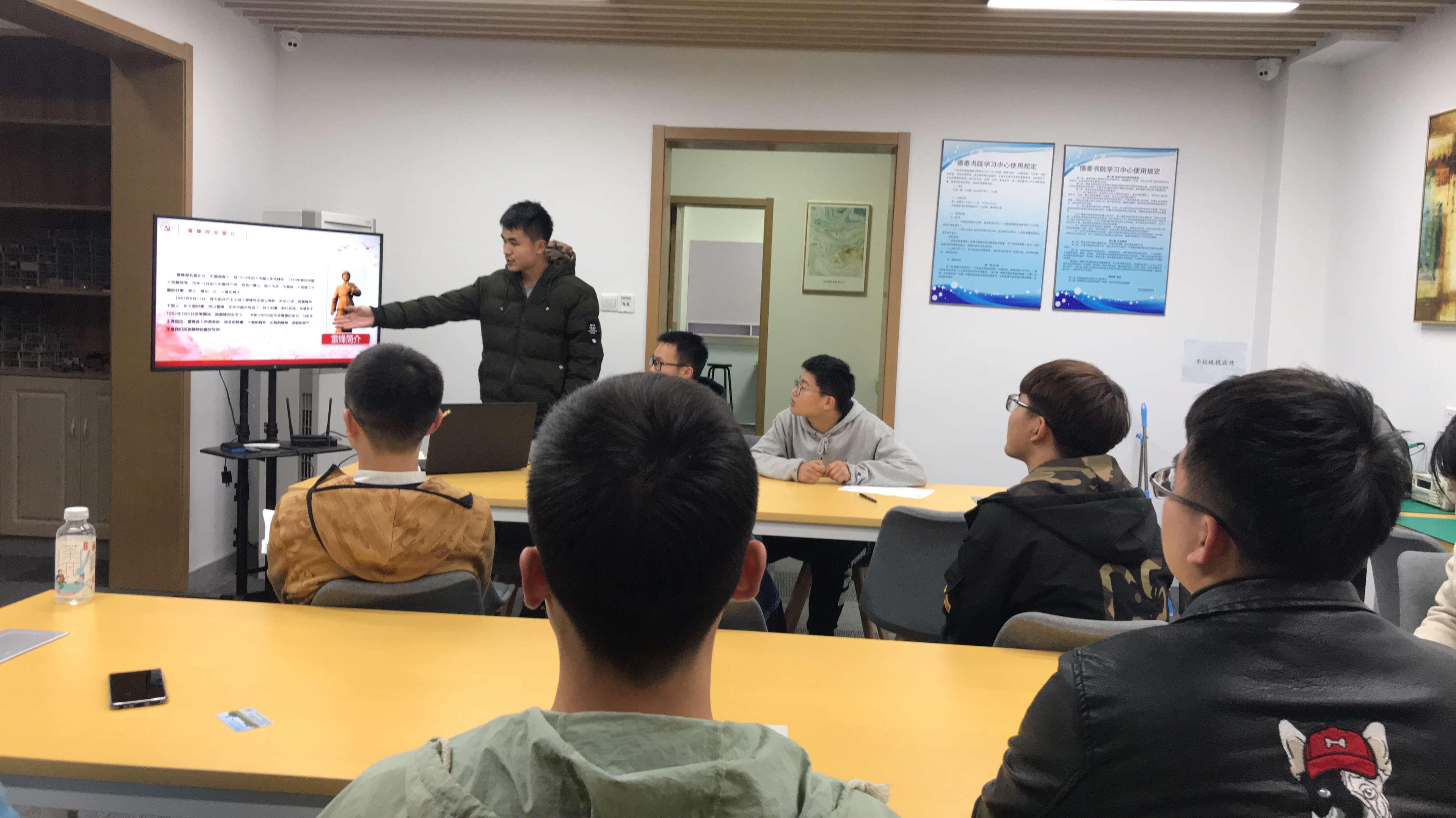 各班级也开展了组织打扫学院办公室、公交车站台、布置各班教室等各种活动。学院党团建设中心充分利用党建进围合的契机,组织入党积极分子在德泰书院讲“身边的雷锋”,通过分享上甘岭战役中大无畏的革命战士,见义勇为的感动中国人物王峰等时代英雄,感受榜样的力量。同学们纷纷表示,雷锋不是一个单纯的人物,“学雷锋”也不是一句简单的口号,他更是一面时代的旗帜,精神的支柱,召唤着年轻一代大学生从小从心,从身边的一点一滴做起,向上向善,完善自己,温暖他人。(边泉 李玲)