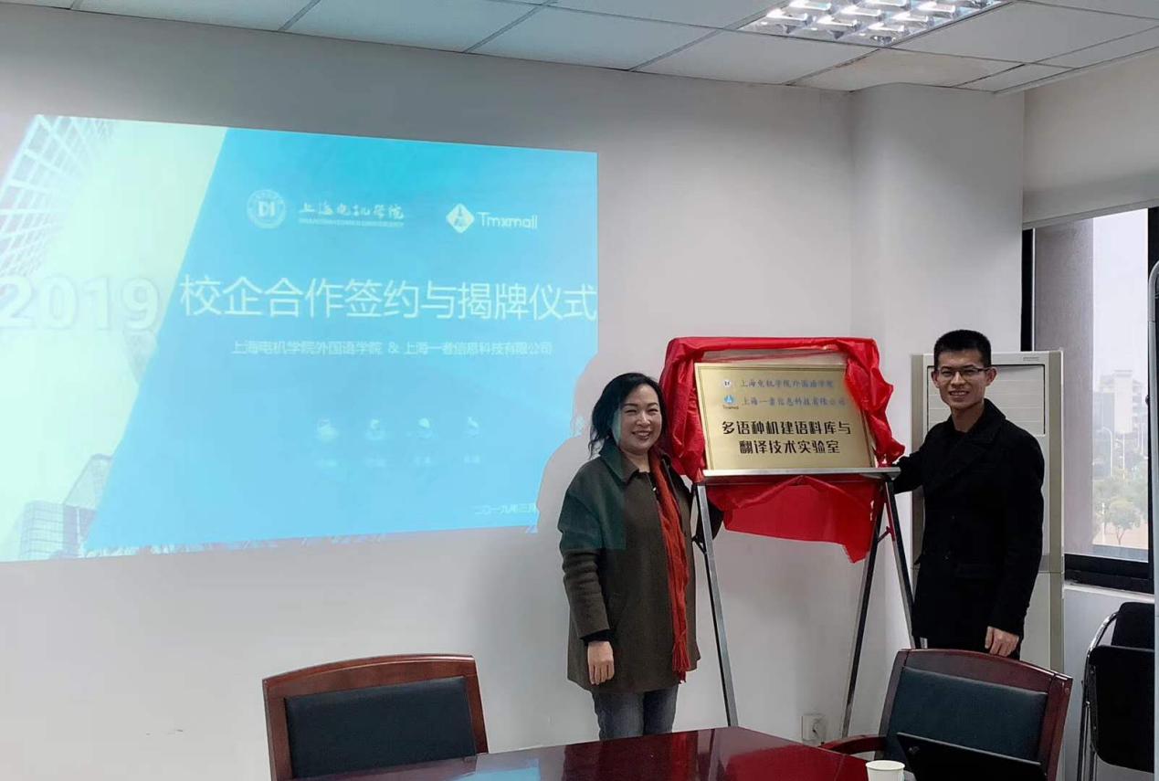 外国语学院党政班子成员金臣忠、张玉双、郭应可,上海一者信息科技有限公司(Tmxmall)创始人兼CEO张井、商务经理崔腾原等参加了协议签订和“多语种机建语料库与翻译技术实验室”揭牌仪式。