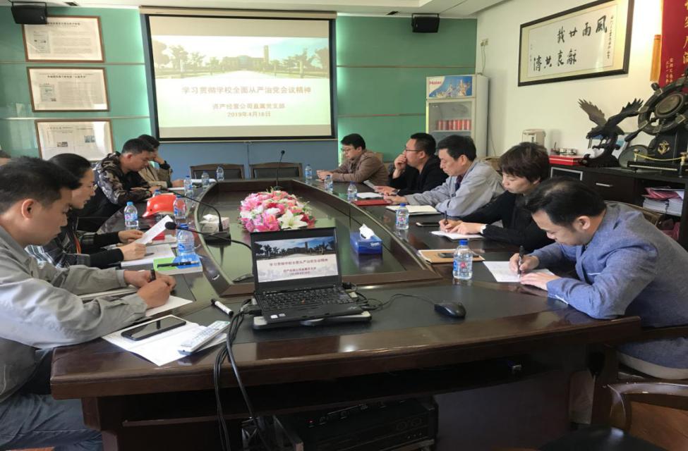 为深入贯彻学校2019年全面从严治党工作会议精神,4月18日上午资产经营公司在上海昂电电机有限公司召开了学习贯彻会议。公司领导、各下属公司负责人及办公室主任、党员、党风监督员参加了会议。会议由资产经营公司直属党支部书记康秀珠主持。