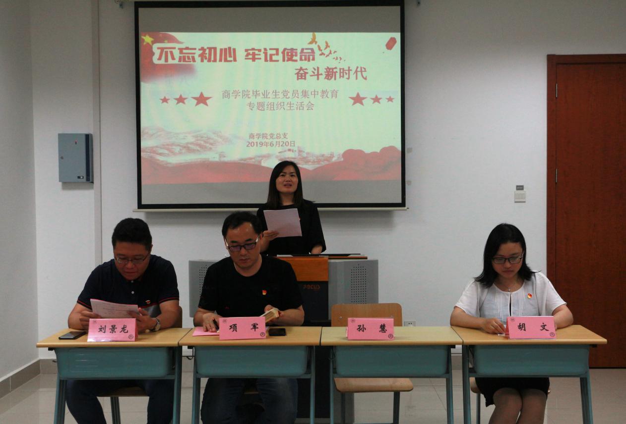 6月20日晚,商学院党总支在商院224开展了以“不忘初心,牢记使命,奋斗新时代”为主题的毕业生党员集中教育专题组织生活会,党总支书记项军、专职组织员孙慧、第七党支部书记胡文、第八党支部书记刘景龙、商学院全体学生党员、部分发展对象和积极分子代表参加了本次专题组织生活会,会议由孙慧主持。