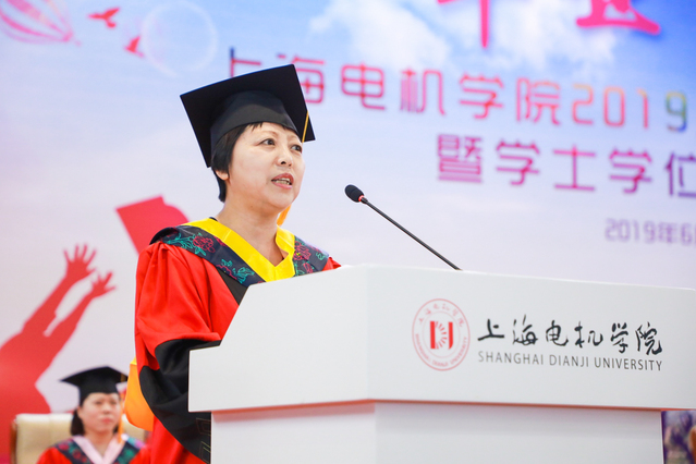 电气学院迟长春教授代表学校全体教职员工,向毕业生们送上殷切的希望和谆谆教诲。她告诉同学们三句话:一是希望毕业生们永怀感恩之心,与人为善;二是希望毕业生们修得忍耐之心,积跬步致千里 ;三是希望毕业生们秉持平常之心,用平常心铸就伟大。