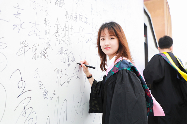 临港校区体育馆外安放着一块毕业签名墙,安静地等候着毕业生们的到来。回首大学四年,对大多数毕业生来说,自己作为新生入学仿佛还发生在昨天,时光匆匆,抓紧正式毕业前的尾巴,合影留念,定格青春,在签名墙上写下自己的名字与赠言,留下与母校的记忆。