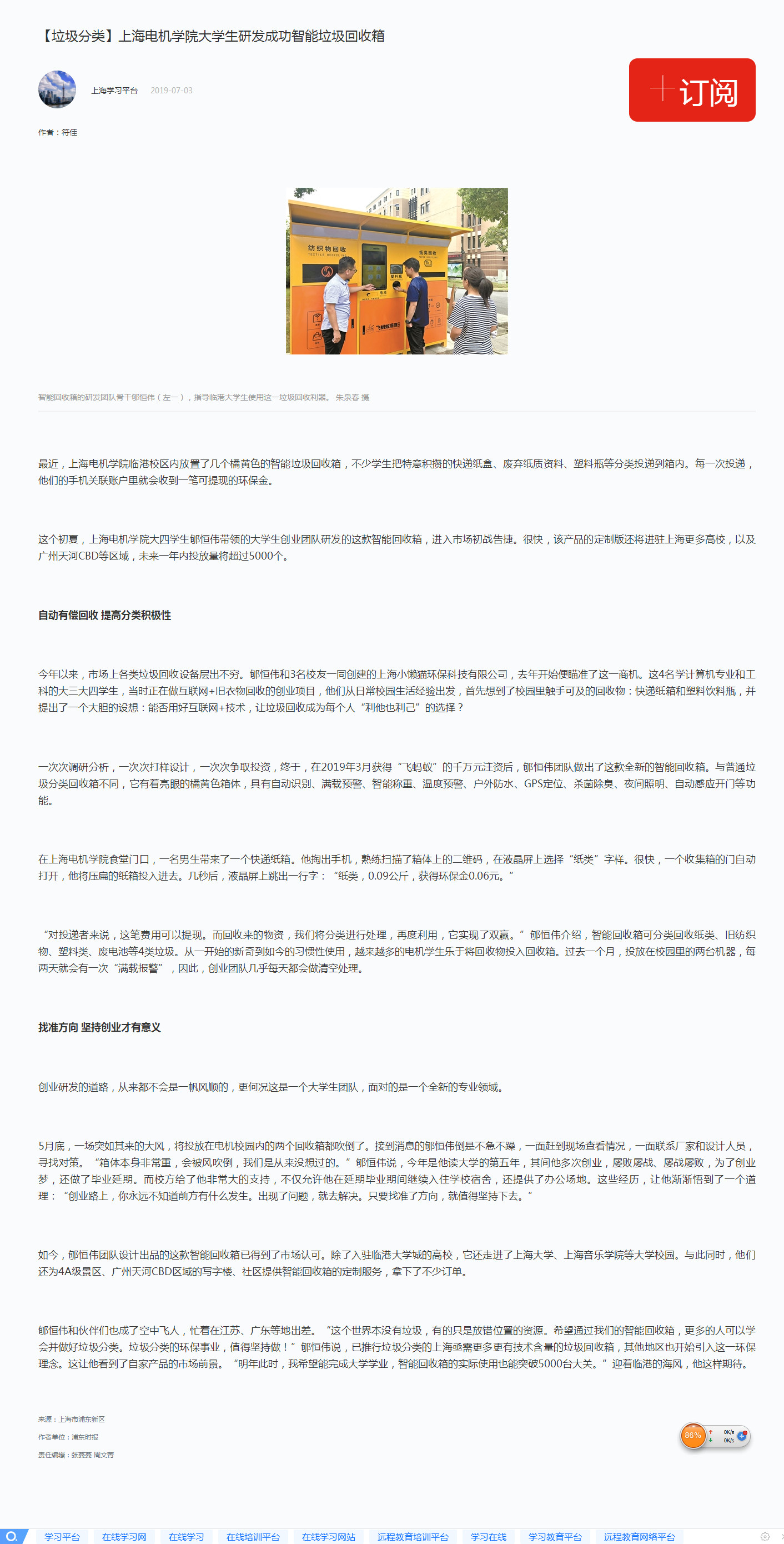 【学习强国】上海电机学院大学生研发成功智能垃圾回收箱