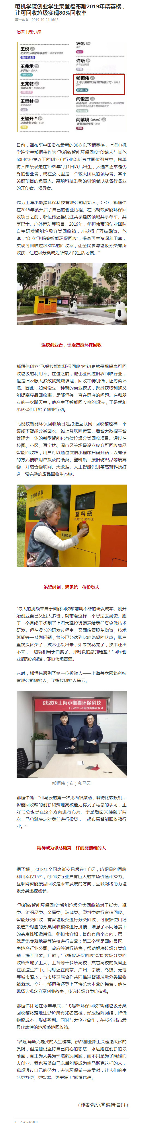 【第一教育】电机学院创业学生荣登福布斯2019年精英榜,让可回收垃圾实现80%回收率