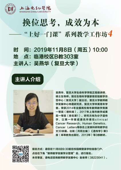 复旦大学吴燕华老师的讲座“换位思考,成效为本——‘上好一门课’系列教学工作坊4”延期至11月8日(本周五)上午10:00举行,请老师们相互转告,积极参加。