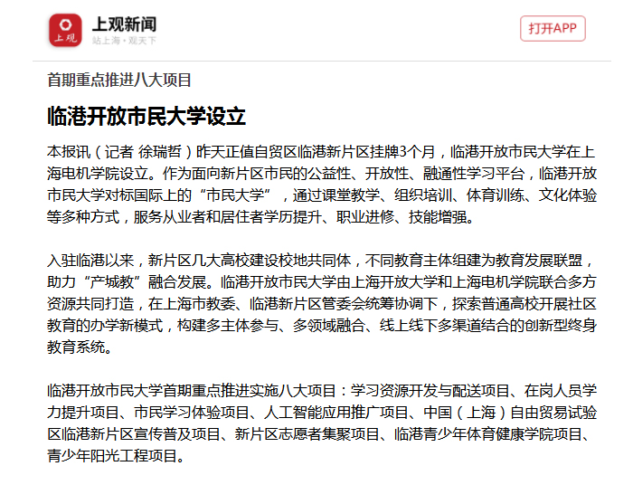 【上观】首期重点推进八大项目 临港开放市民大学设立