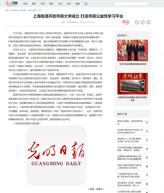【光明网】上海临港开放市民大学成立 打造市民公益性学习平台
