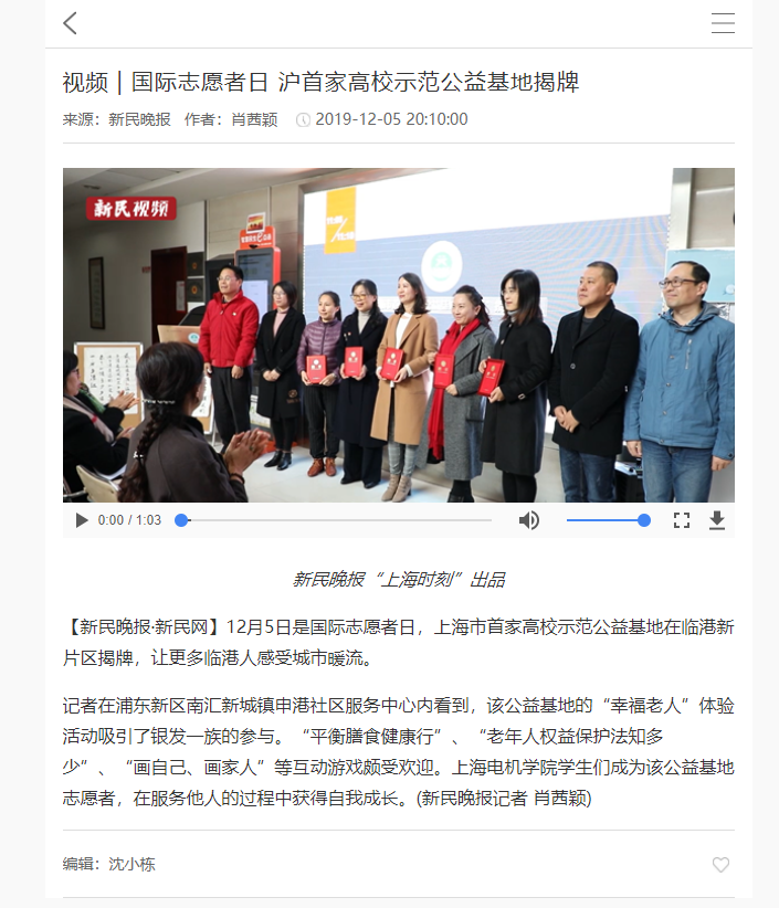【新民晚报】国际志愿者日 沪首家高校示范公益基地揭牌