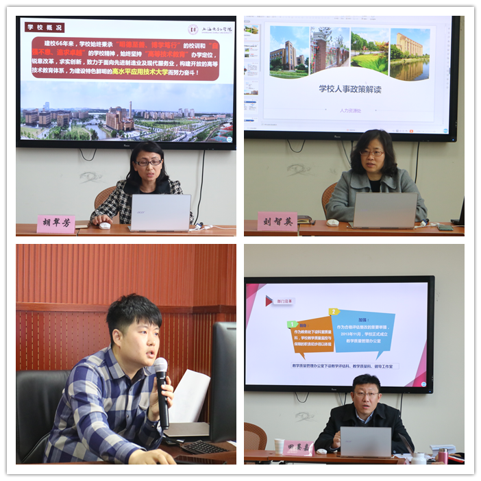 教学能力的提升由导师指导和集中学习两种方式共同完成。每位新教师在校本研修阶段都能得到一对一的资深学科导师指导,新教师跟随本校学科导师围绕其学科专业展开一系列教学实践活动,如相关课程的教学材料研读、集中备课、教学观摩、试讲、反馈与改进等。此外,教师教学发展中心还组织了学校定位发展,人才培养目标,专业建设、课程建设,教师教学规范等校情相关的集中学习活动。11月26日,学校发展规划处胡翠芳老师以“学校发展定位”为主题与教师们展开探讨,胡老师介绍了学校概况,包括教学机构、专业设置、在校学生等背景;阐述了学校近年来改革发展状况,包括办学定位、人才培养、及学科建设等情况;分析了学校所处的高等教育大环境、发展愿景及目标,让大家对本校乃至上海高校都有了框架性认识。同日,人力资源处处长刘智英为新教师解读了学校人事政策,涵盖新进教师首聘期考核、教师职称分类评聘等相关人事制度和教师专业发展的各类提升计划,这些内容与教师晋升及职业发展规划息息相关,在场教师纷纷提出具体问题并得到了详细解答。11月28日,质量管理办公室副主任田晏嘉解读了我校教学质量保障、监测、评估体系相关内容和教学质量规范要求,阐述了校院两级质量保障体系和教学质量评估体系相关内容,梳理了我校教学工作质量要求和规范相关内容并勉励大家规范教学。11月29日下午,超星集团的张李健文老师做了题为《泛雅网络教学平台助力打造混合金课》的讲座,在促进教学改革与创新,推进我校在线开放课程资源建设的背景下,进一步提高新教师信息化教学水平。通过现场学习,新教师们直观地参与体验了“一平三端”的课堂互动功能,了解了超星学习通的主要功能与操作方法。12月11日和12日教师教学发展中心为全体新教师安排了微格教学活动,每位新教师准备一个20分钟的的教学设计并对该教学节段进行教学展示。首日邀请到机械学院侯培红教授、商学院隋丽辉教授、电子信息学院刘文红教授,次日邀请到电气学院高桂革教授、材料学院王晓梅老师(第二届上海青教赛自然科学应用学科组二等奖)、文理学院柯磊老师(校第二届微课教学竞赛一等奖)作为专家进行现场点评交流,从专业角度为新教师在教学设计、教学内容、教学方法、教学组织、语言教态等方面给予针对性指导,不断提升改进新教师的教学能力。