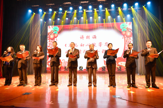全体校领导带来配乐诗朗诵《不忘初心绽芳华,砥砺前行又一程》。“我们谋略着大步向前的美好,憧憬着编织未来的精彩!不忘初心,牢记使命,2020,我们已经出发,在路上!”