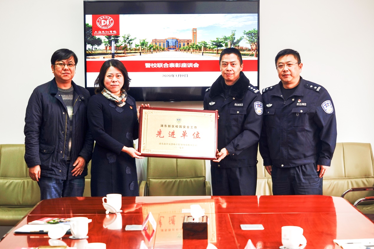 1月9日,警校联合表彰座谈会在行政楼316会议室召开。我校荣获浦东新区校园安全工作先进单位,警方给学校颁发了先进单位奖牌。校党委副书记、副校长李晓军和保卫处参加。