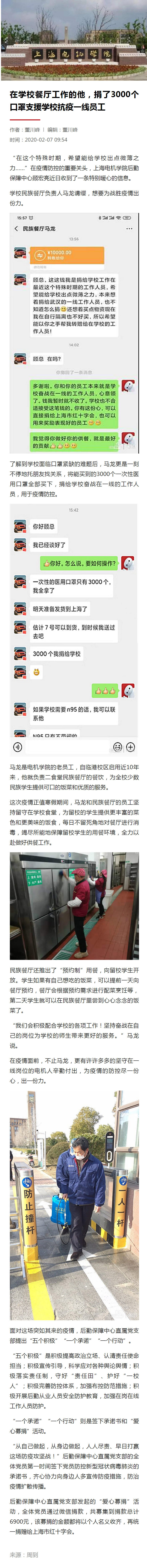【周到】在学校餐厅工作的他,捐了3000个口罩支援学校抗疫一线员工