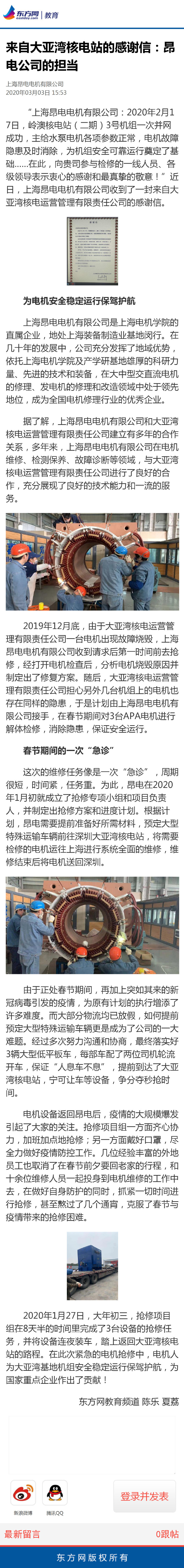 【东方网】来自大亚湾核电站的感谢信:昂电公司的担当
