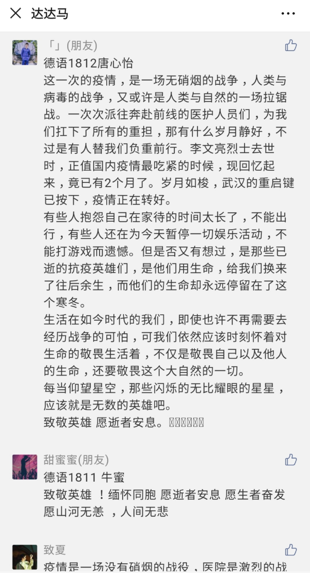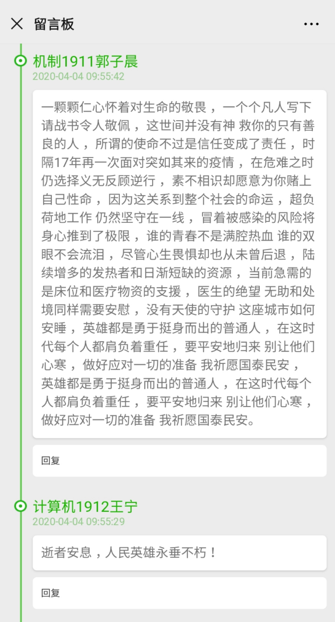 截止10点30分,达达马《清明祭|寄哀思,敬无畏》线上主题祭扫活动浏览量突破4000,后台留言905条,全国各地的电机学子们以最沉痛的心情悼念、敬仰逝去的烈士,哀思逝去的同胞。