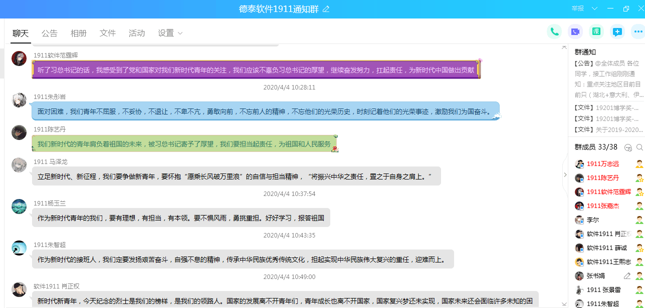 高职学院第二、四党支部的“90后”辅导员、学生党员在线上认真阅读与学习了习近平总书记的回信,受到极大激励与鼓舞。各位同学纷纷表示,在重大疫情面前,要坚决发挥党员同志先锋模范作用,展现担当作为,坚决做到带头提高政治站位,认真领会习近平总书记的号召;带头配合疫情防控,带头听从学校安排,帮助身边的同学树立正确理念,增强防控意识。以身作则,服从指挥,用自己的行动践行初心、抗击疫情,迎难而上,为取得疫情阻击战的完全胜利继续奋斗。