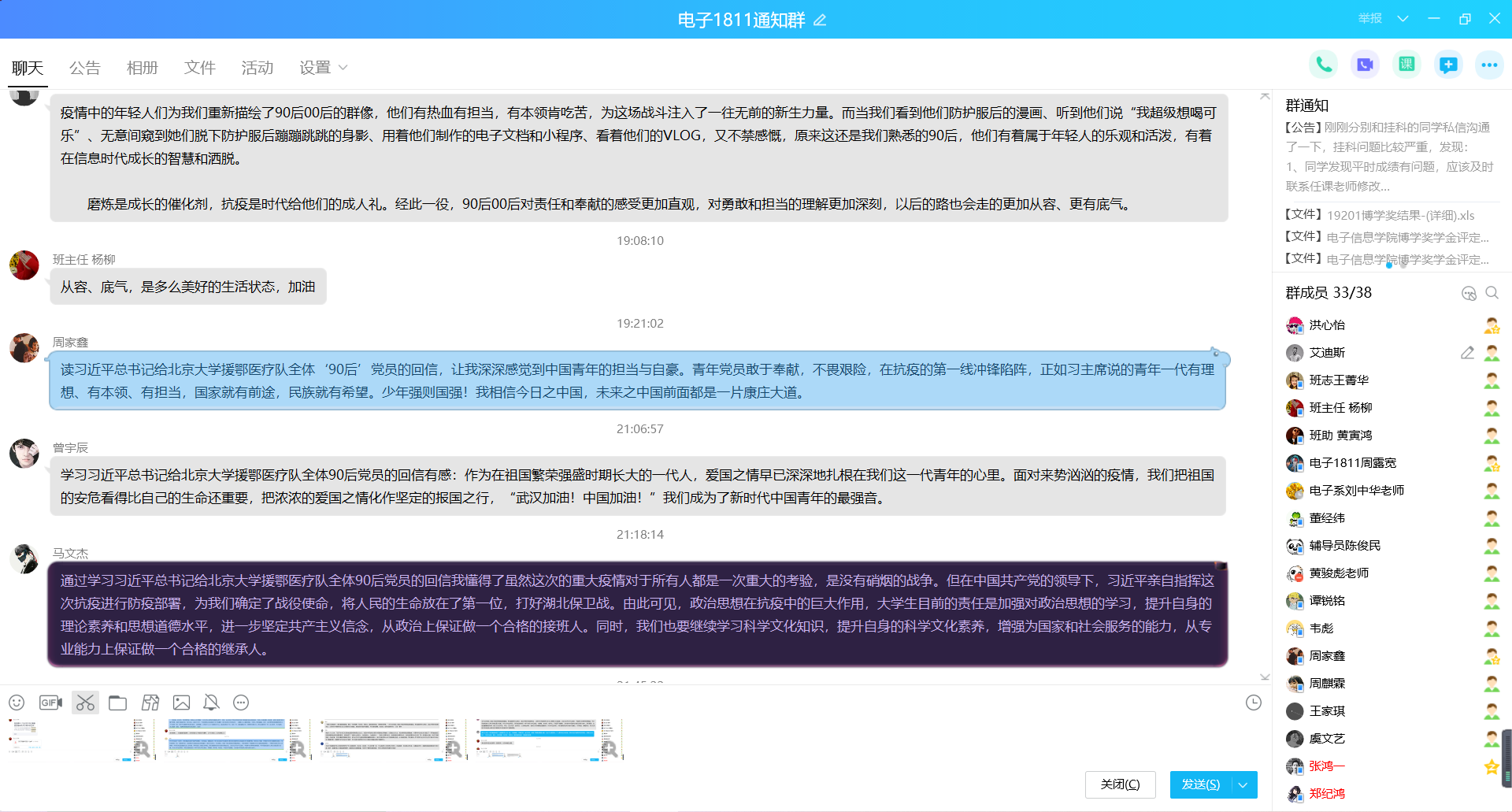 “我更应坚定政治立场,时刻牢记总书记的殷切嘱托。” 这是电子信息学院一位同学在“云”班会上所做的发言。电子信息学院党总支第四党支部抓住育人契机,召开“纸短情长,习近平总书记回信里的殷殷情怀”四月线上主题党日活动,号召全体党员不忘初心,牢记使命,向北大援鄂医疗队青年党员学习!