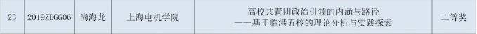 另据《2019年度上海学校共青团工作研究课题结项评审结果》,尚海龙老师的《高校共青团政治引领的内涵与路径—基于临港五校的理论分析与实践探索》经专家评审、综合评定,最终授予二等奖荣誉。