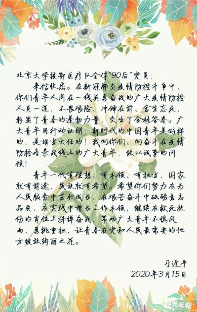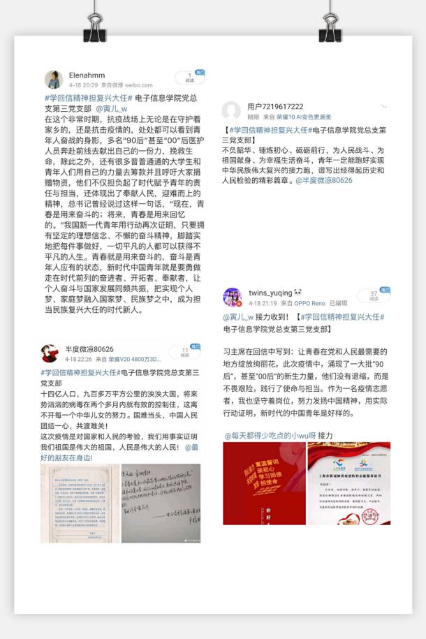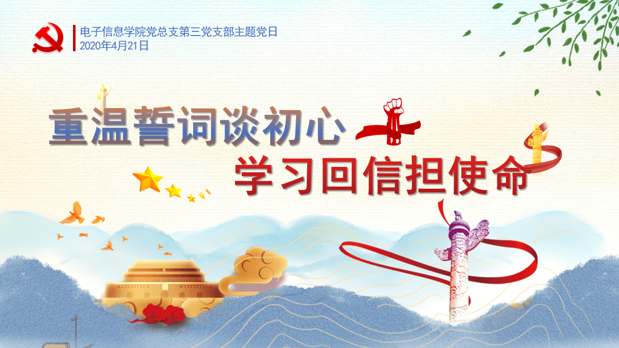 3月15日,中共中央总书记、国家主席、中央军委主席习近平给北京大学援鄂医疗队全体“90”后党员回信,信中指出,在这次抗击疫情的斗争中,以“90后”为代表的青年一代挺身而出、担当奉献,充分展现了新时代中国青年的精神风貌。为带动广大青年不惧风雨、勇挑重担,让青春在党和人民最需要的地方绽放绚丽之花,4月21日下午,电子信息学院党总支第三党支部在腾讯会议平台召开了“重温誓言谈初心 学习回信担使命”主题党日活动。会议持续一个多小时,包括重温入党誓词、谈入党初心、学回信精神、线下作品展示以及近况交流等环节。