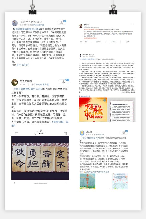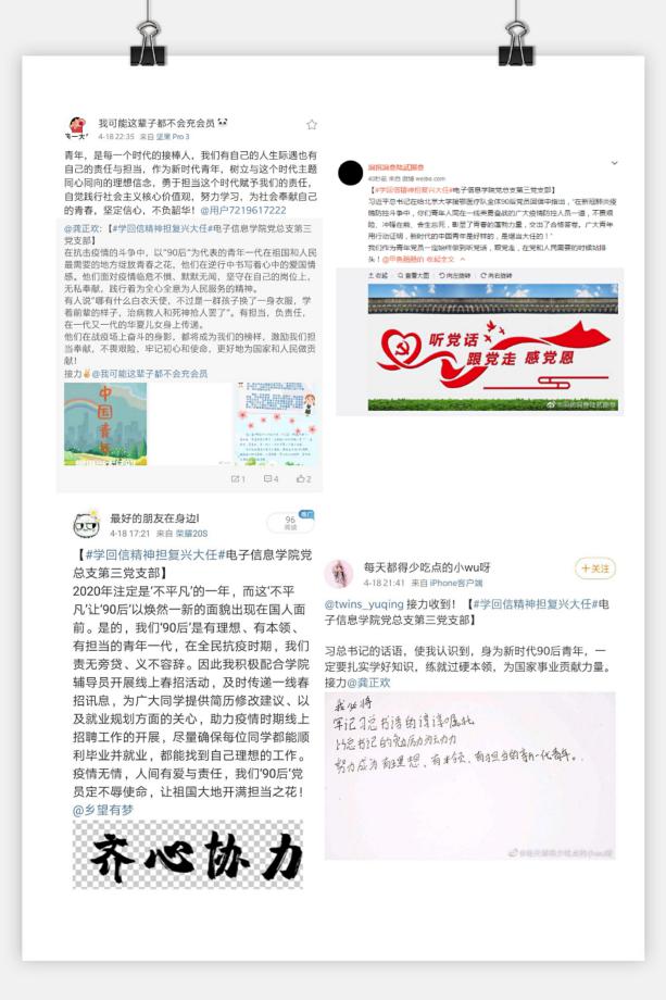 线下作品展示环节中,支部学生党员通过微博转发、接龙活动分享了学习回信精神的感想。