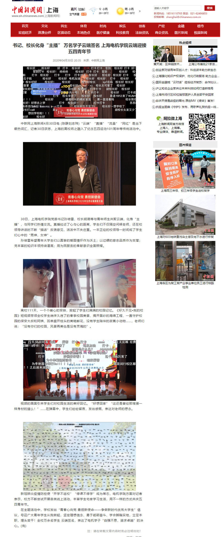 【中国新闻网】书记、校长化身“主播” 万名学子云端签名 上海电机学院云端迎接五四青年节