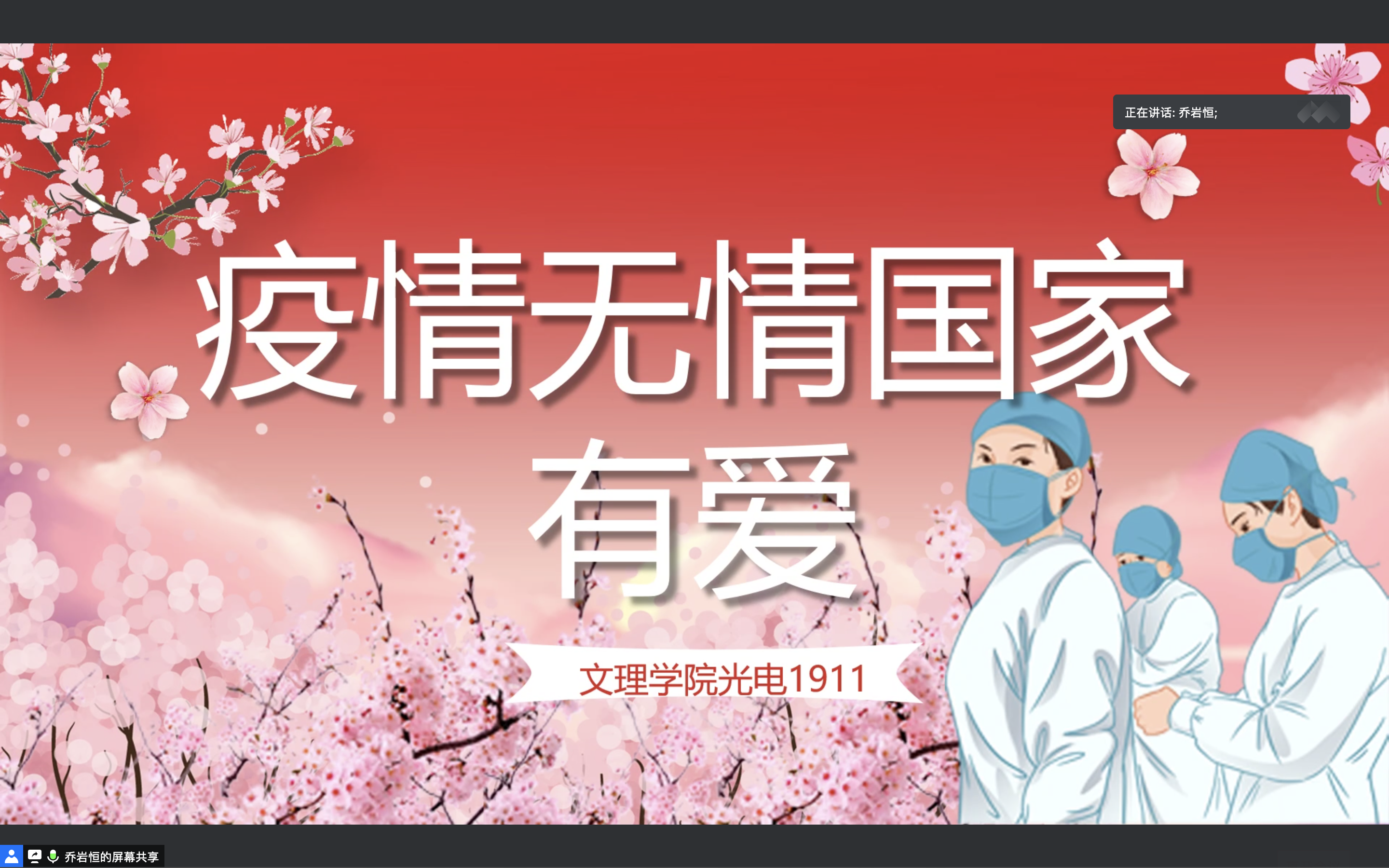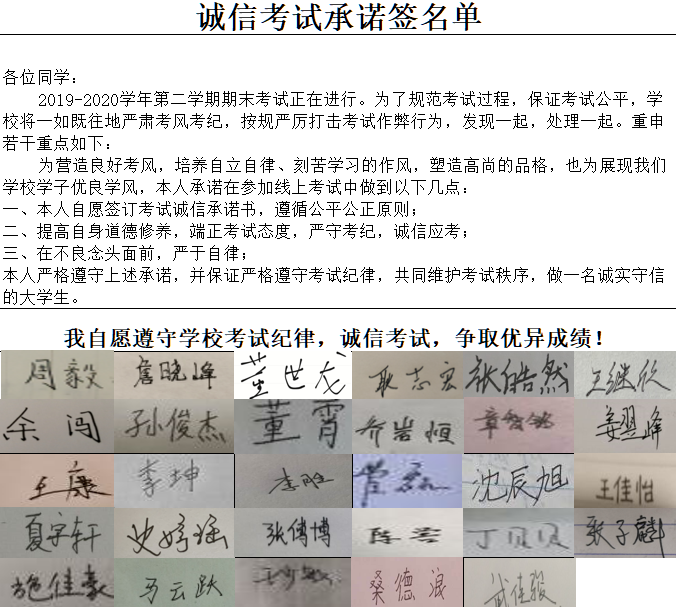 2020年5月23日晚,文理学院光电1911班师生在线开展了视频会议,在庆祝“两会”顺利召开的同时,以PPT、视频等形式分享展示了疫情期间发生在我们身边的感人故事,在此基础上,班主任为即将到来的期末考试开展了诚信教育,希望同学们营造优秀的考风,养成自信自立自律的品质,并能在这次特殊的期末考试中展现文理学子的精神风貌。在班会尾声,全班同学云签署了一份诚信考试承诺书,承诺以优秀的考风献礼“两会”。