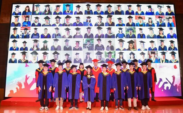 毕业典礼结束后,现场和线上的学校领导、导师和毕业生们通过会场大显示屏来了一张毕业留影。