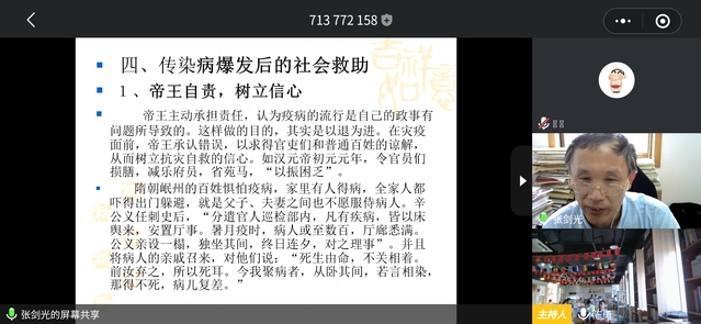 张剑光教授从历史上的传染病情的简单回顾,古代传染病发生的特点和条件,古代传染病带来的灾难,古代传染病爆发后的社会救助,古代传染病丰富的现代启示等几个方面总结出抗疫取得胜利必须要遵循历史自然规律的客观精神。他讲到人类历史实际上是一部与传染病斗争的历史,传染病的流传伴随着人类历史的发展成百上千,种类各式各样,给我们的祖先带来了巨大而无穷的苦难与悲哀,十几年前的非典和后来的N1H1、N7H9流感,最近的新冠肺炎肆虐等,让大家谈疫色变,但只要我们相信科学,在制度安排上进行规范化的预防措施,就可以有效地对传染病进行控制,就能杜绝传染病的蔓延扩散。