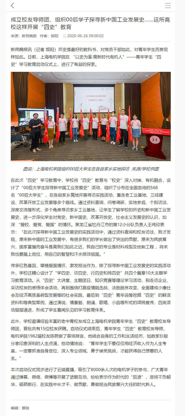 【新民晚报】成立校友导师团、组织00后学子探寻新中国工业发展史……这所高校这样开展“四史”教育