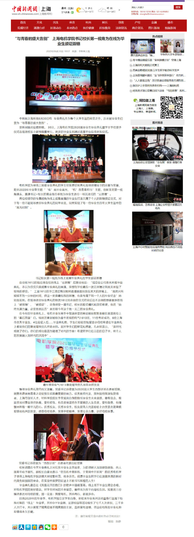 【中国新闻网】“与青春的盛大告别” 上海电机学院书记校长第一视角为在线为毕业生颁证拨穗