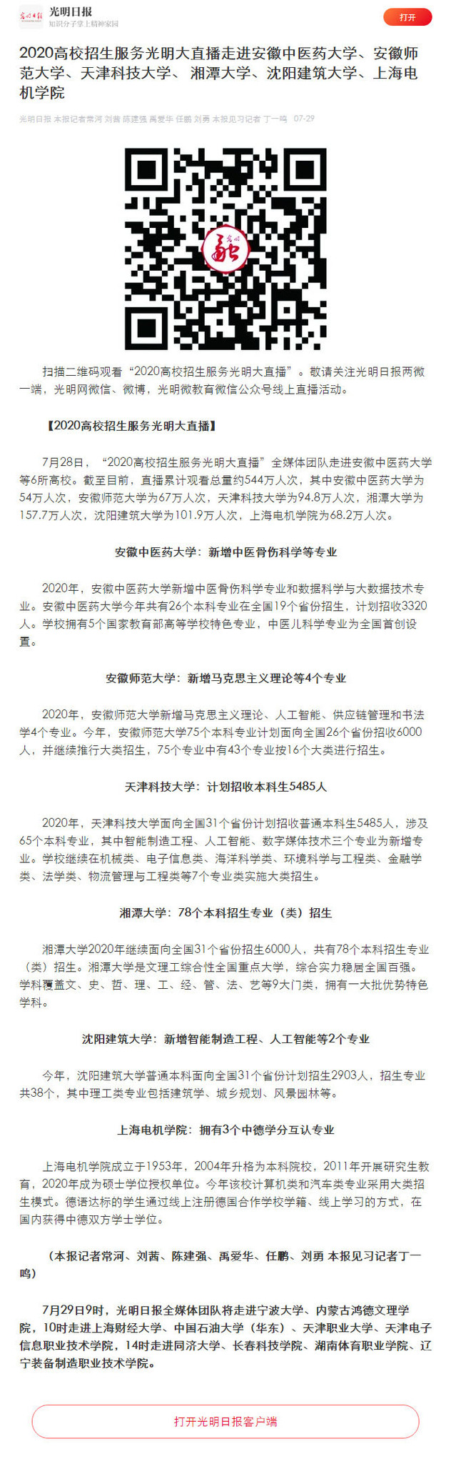 【光明日报】2020高校招生服务光明大直播走进安徽中医药大学、安徽师范大学、天津科技大学、 湘潭大学、沈阳建筑大学、上海电机学院