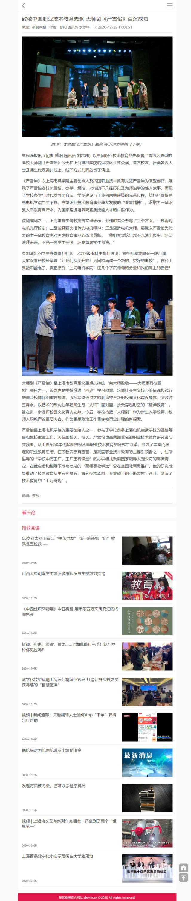 【新民晚报】致敬中国职业技术教育先驱 大师剧《严雪怡》首演成功