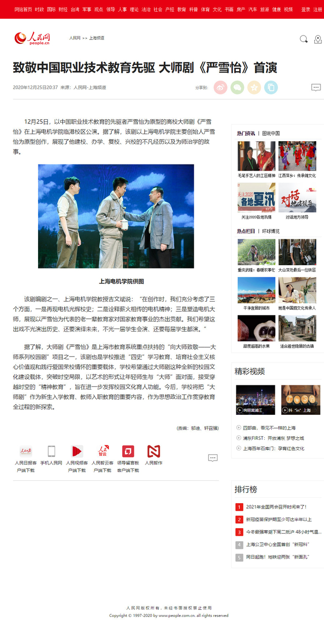 【人民网】致敬中国职业技术教育先驱 大师剧《严雪怡》首演